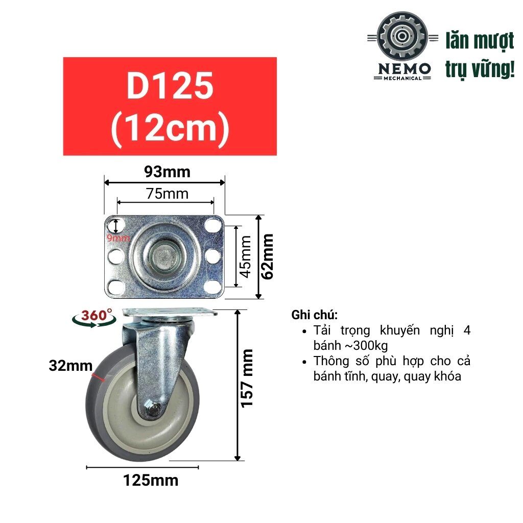 Đa dạng lựa chọn: Có nhiều phiên bản gá lắp: tĩnh, quay, quay kèm phanh, cọc vít quay và cọc vít phanh → dễ dàng lựa chọn theo nhu cầu.