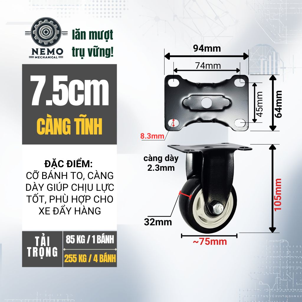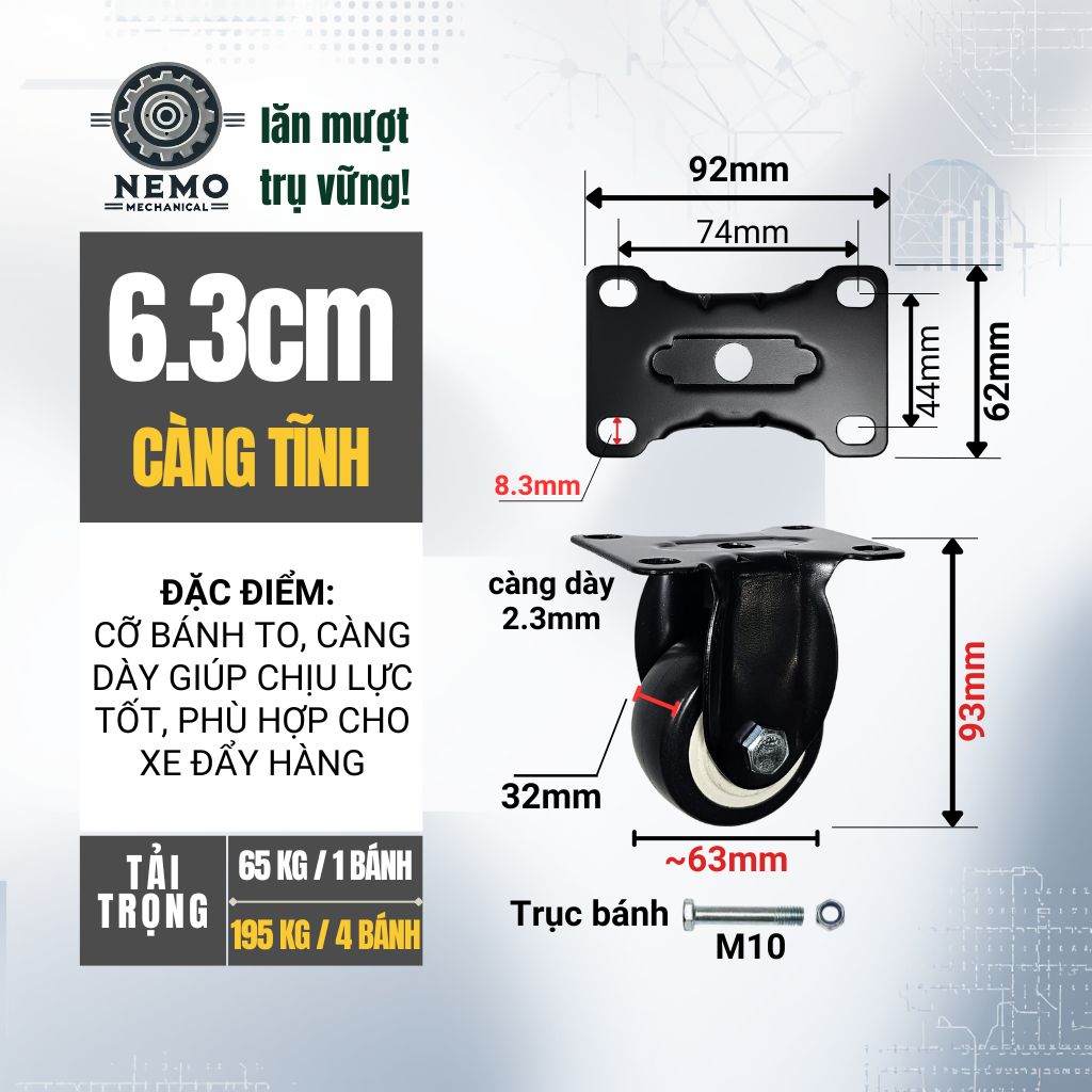 - Khung càng thép chắc chắn:Toàn bộ càng bánh làm từ thép dày, bề mặt sơn tĩnh điện đen chống rỉ sét, tăng tính thẩm mỹ và độ bền cho thiết bị.