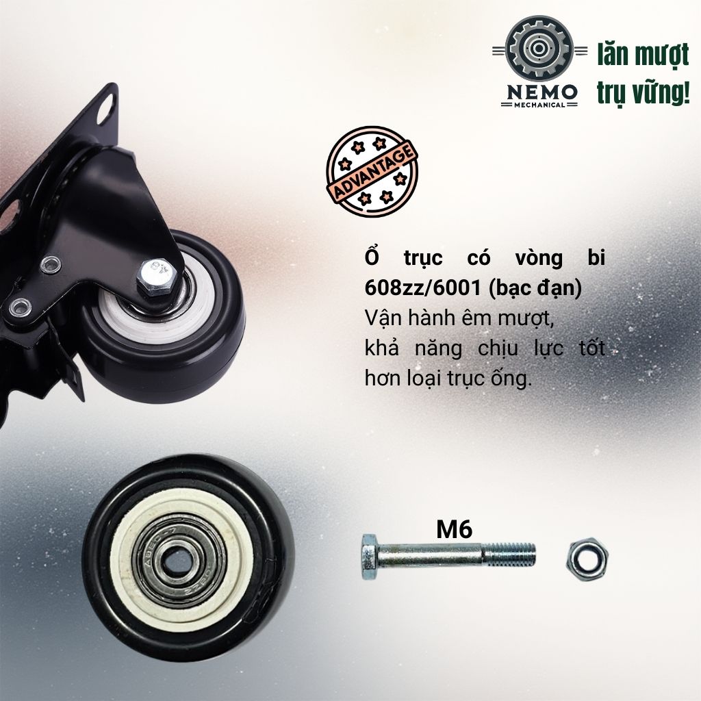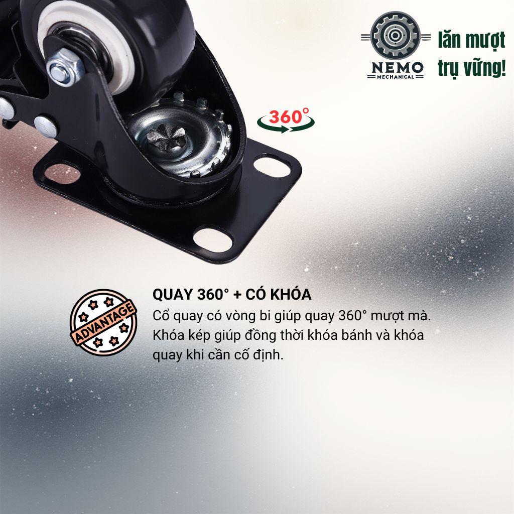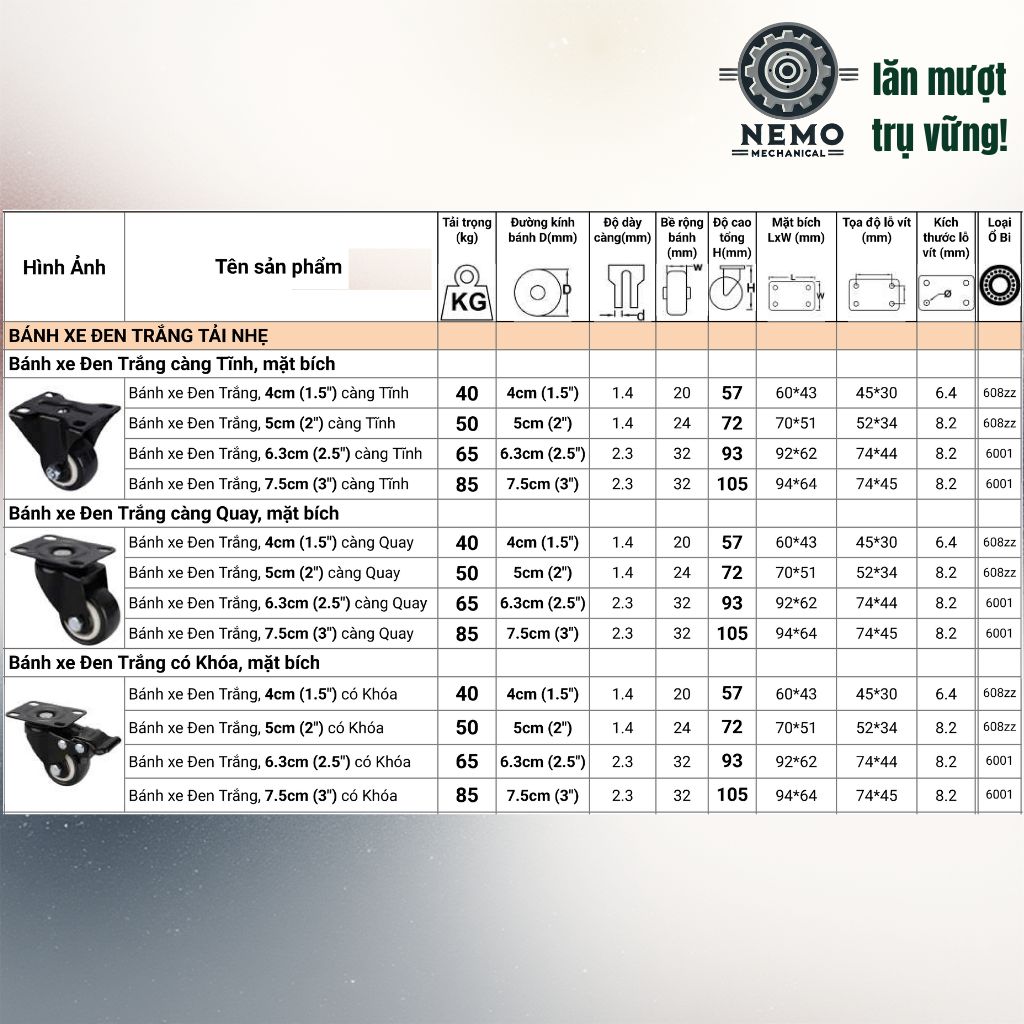 - Đặc tính:Do nhựa PVC có độ cứng cao nên có thể gây ồn khi di chuyển trên bề mặt không phẳng. Nếu bạn cần sự yên tĩnh tuyệt đối cho sàn gỗ, hãy tham khảo dòng bánh xe cao su TPR tại Cơ Khí Nemo.