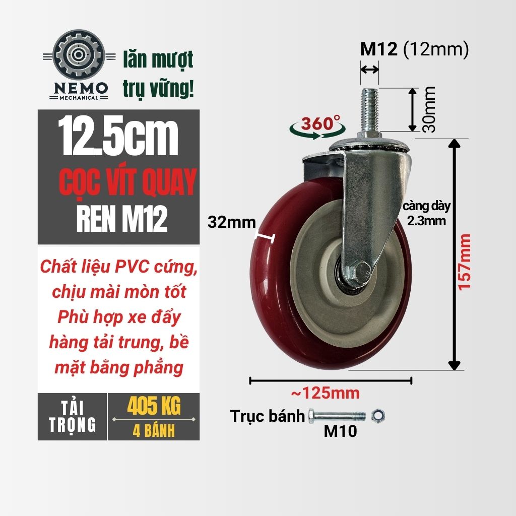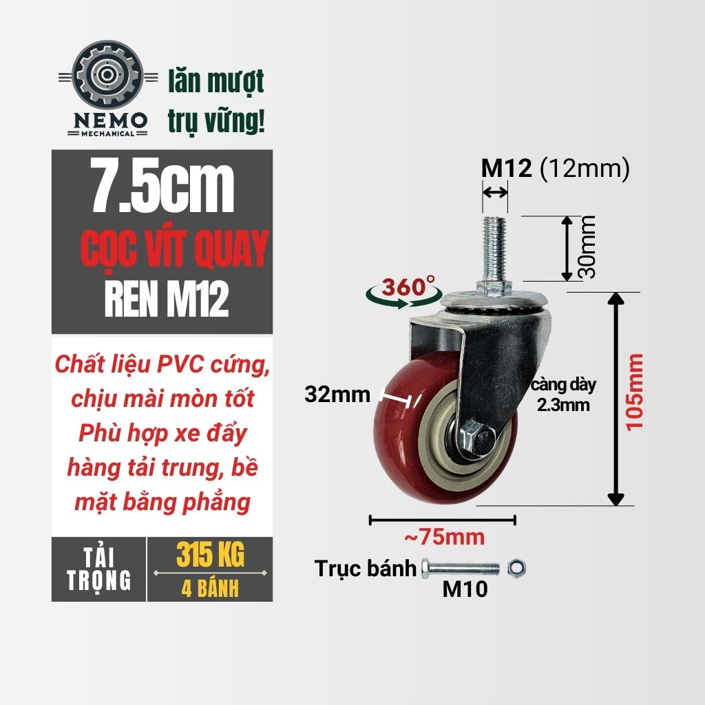 Bánh xe PVC Đỏ Mận cọc vít M12 được thiết kế cho các thiết bị di động có chân ren M12. Sản phẩm sử dụng nhựa PVC cứng chịu lực và khung thép dày, phù hợp cho cả môi trường dân dụng và sản xuất.