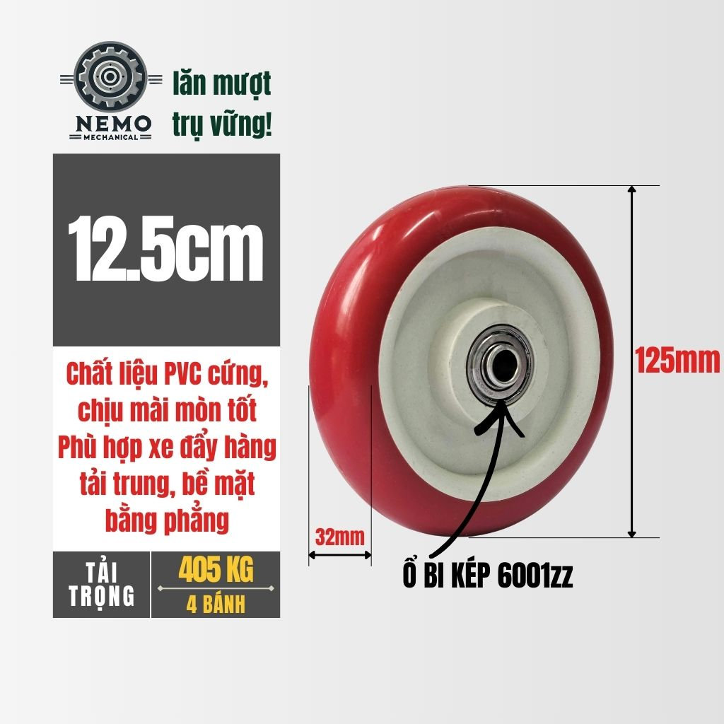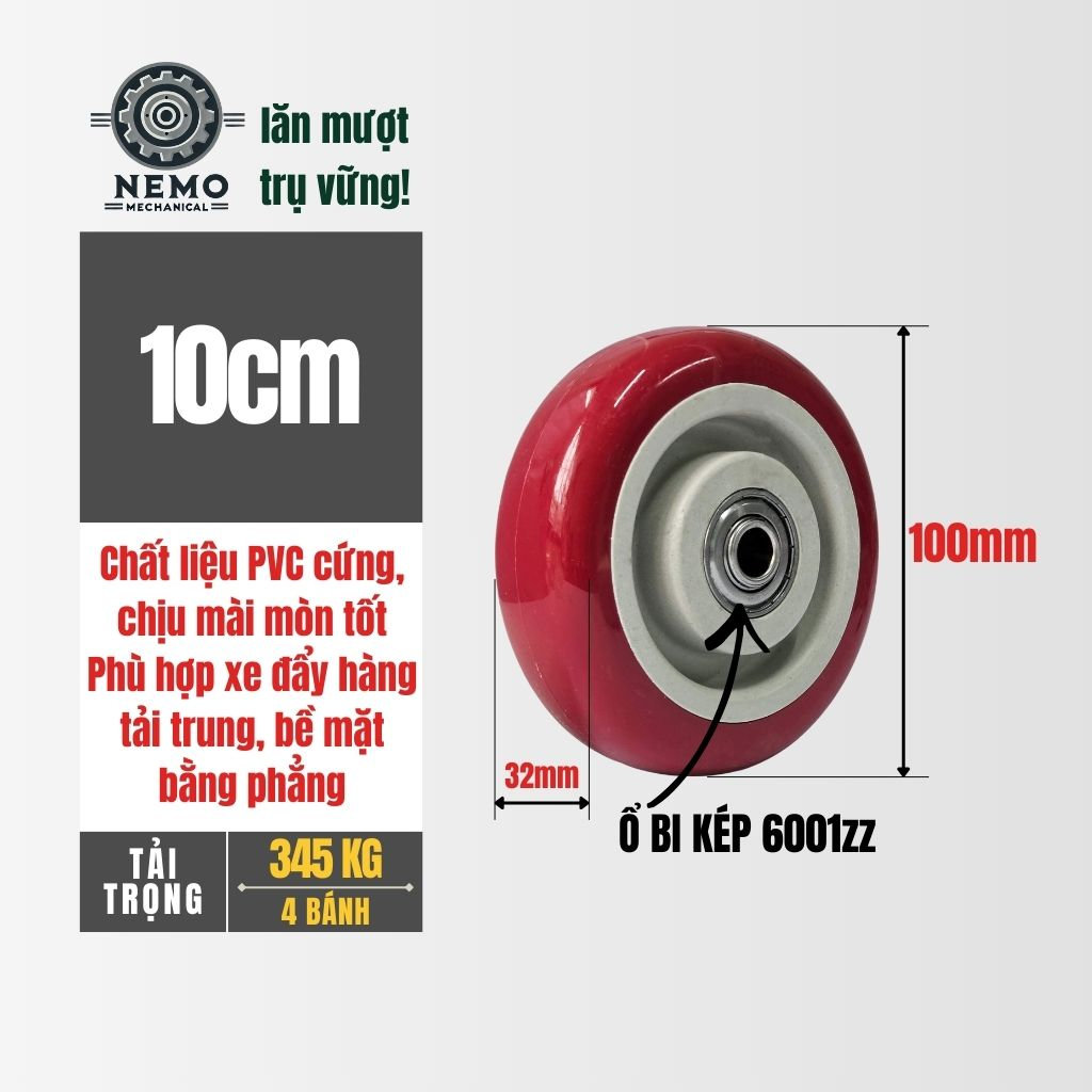 - Vận hành trơn tru:Tích hợp bạc đạn (vòng bi) giúp bánh xe quay êm, giảm sức lao động.