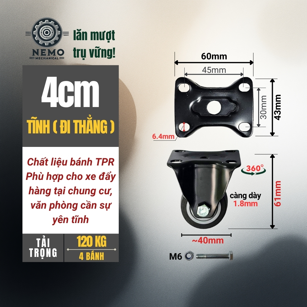 Bánh xe đẩy hàng đen trắng, mặt bích, có bạc đạn, đk bánh 4cm và 5cm, tải trọng 40-50kg/1bánh