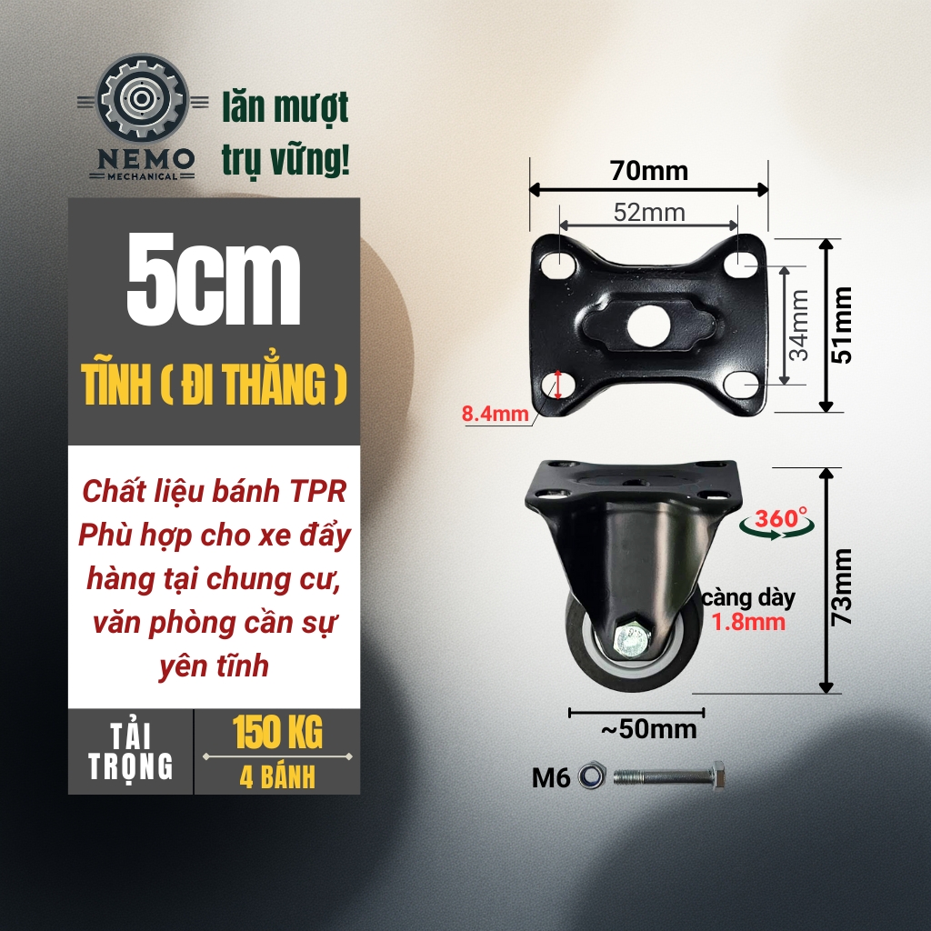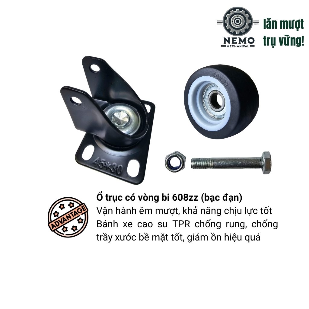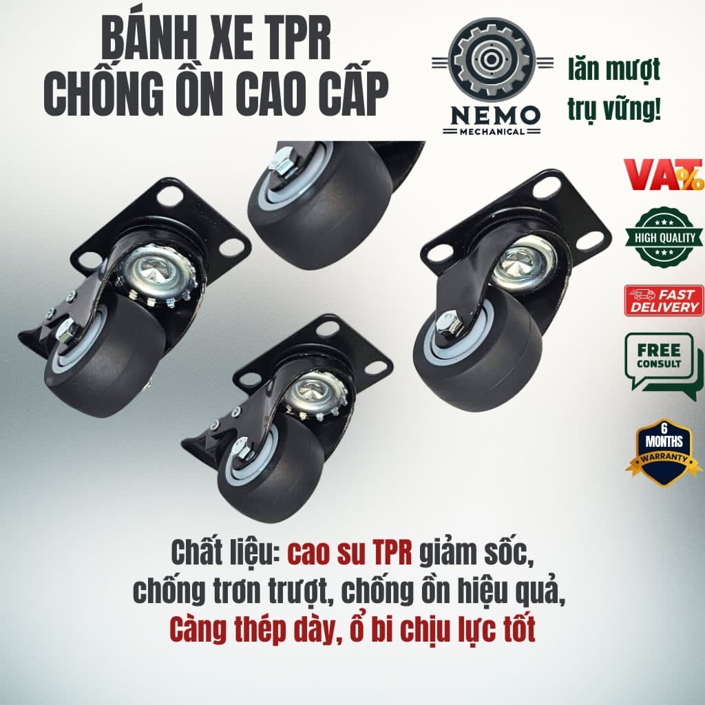 Bánh xe TPR chống ồn, có bạc đạn, tải cao dùng cho xe đẩy di chuyển không gây ồn
